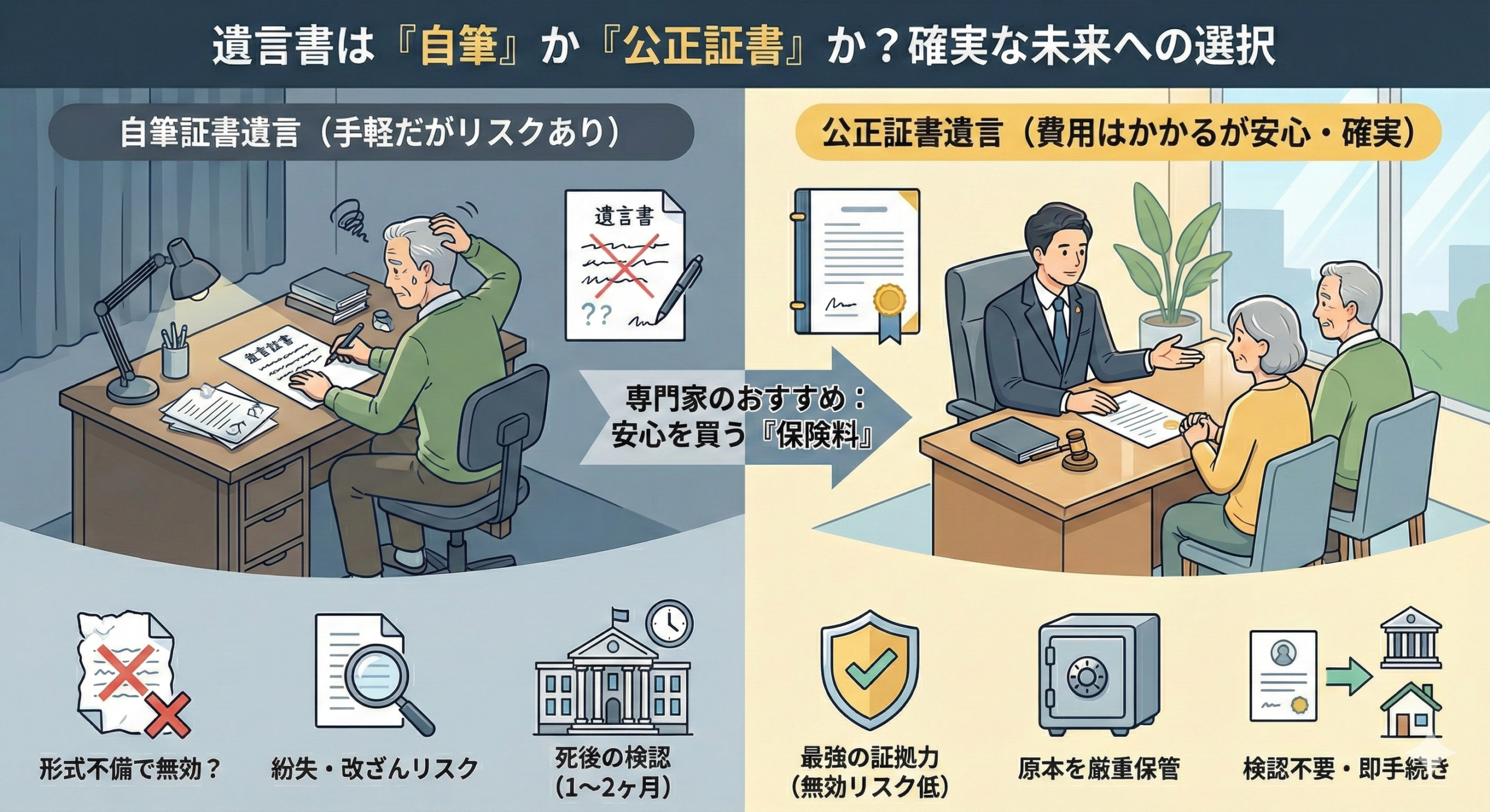 「費用がかかるから自筆でいいや」と思うかもしれませが、無効になって揉めた時の裁判費用や、検認の手間を考えれば、数万円の公証人手数料は「安心を買うための保険料」と考える事も出来ます。