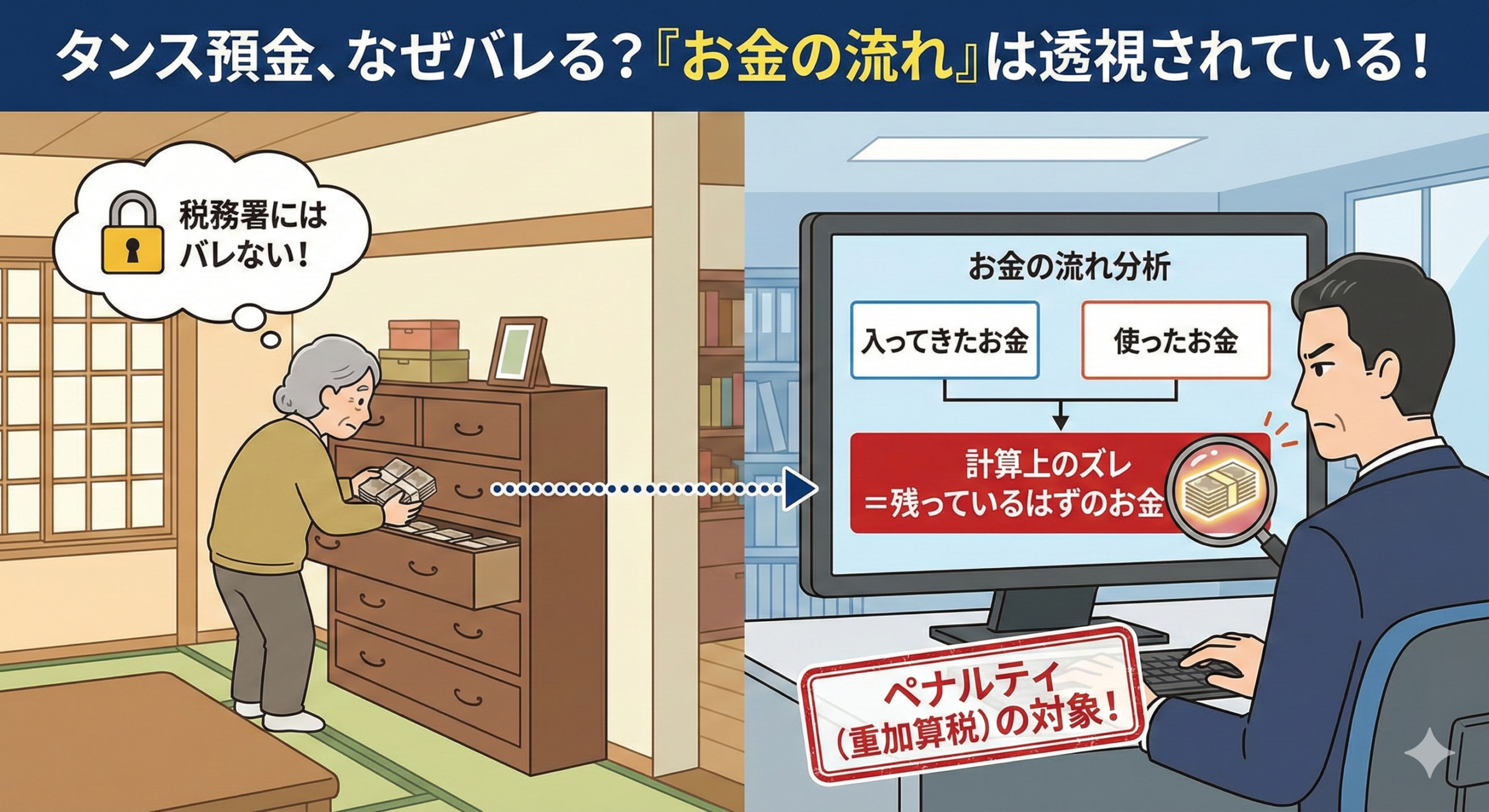 日本のタンス預金の総額は数十兆円とも言われていますが、相続税の申告において、このタンス預金ほど「安易に隠されやすく、かつバレやすい」ものはありません。