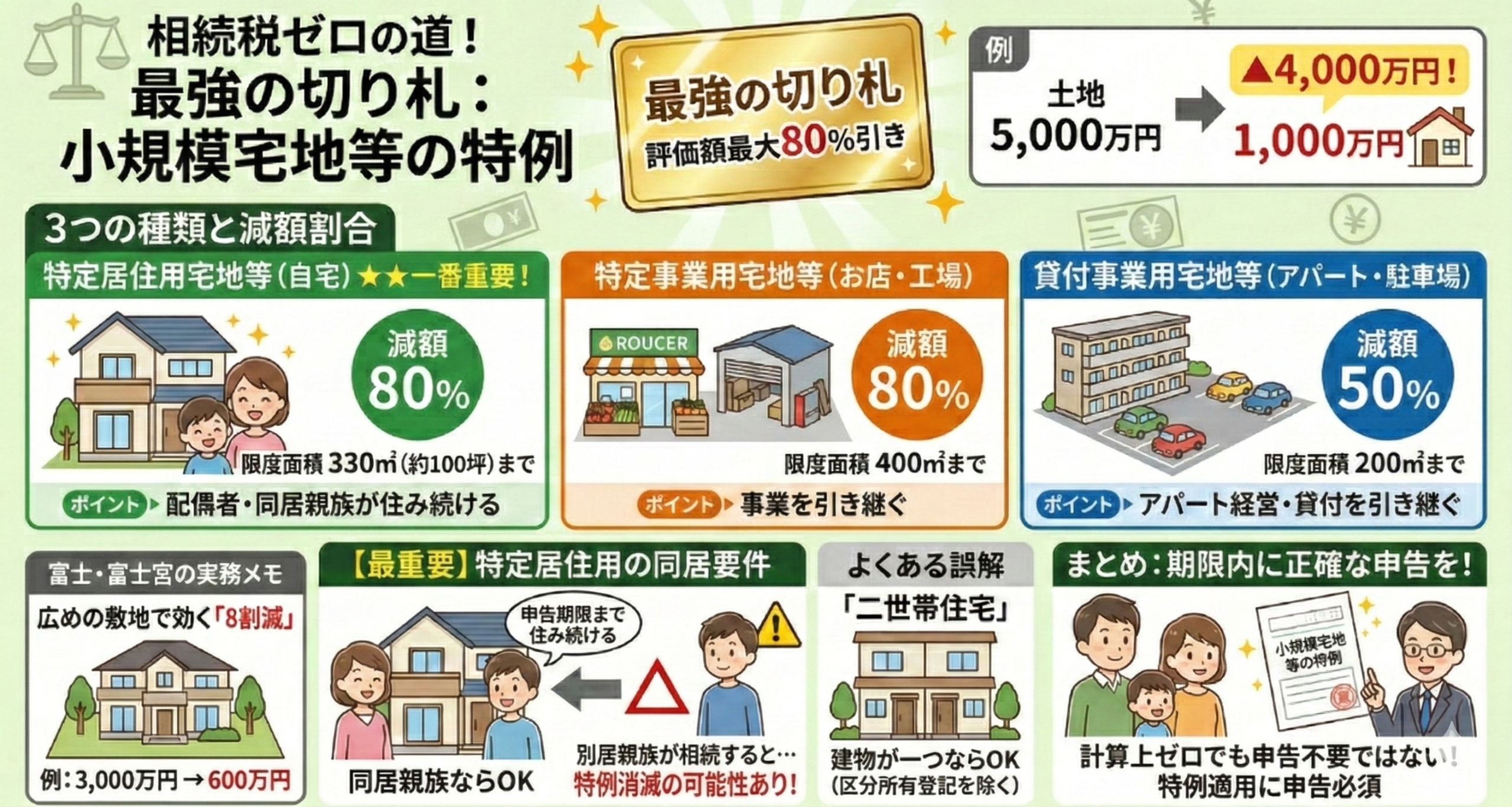 注意点: 「同居していた長男」なら使えたのに、話し合いで「別居の二男」が相続することになった瞬間、この特例は消滅します。人選ミスで数百万円損をしないよう、必ずシミュレーションを行ってください。