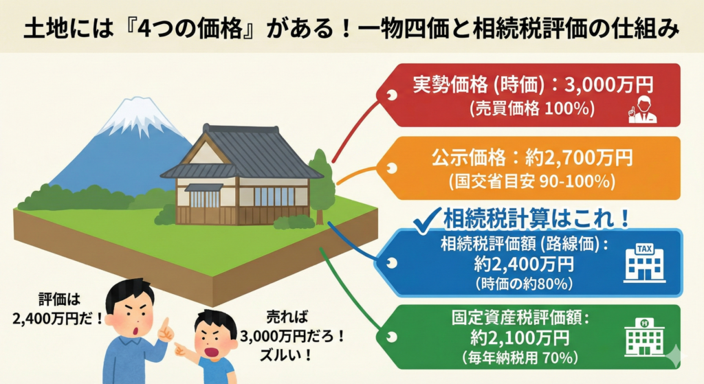 「父が亡くなり、実家の土地を相続することになった。近所の不動産屋に聞いたら『3,000万円くらいで売れる』と言われたから、相続税も3,000万円に対してかかるのだろうか?」 いいえ、違います。 実は、日本の土地には「4つの価格(一物四価)」が存在し、... -